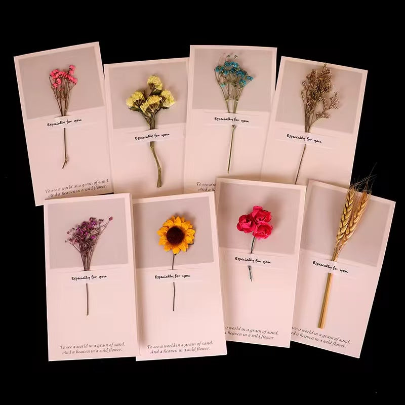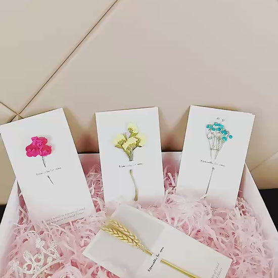 These beautiful dried flower greeting cards feature real pressed flowers carefully arranged on minimalist cards. Each card carries the message “Especially for you” and a poetic line: